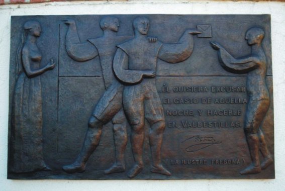 La lápida original (desconozco si ya ha sido reemplazada por la nueva) estaba firmada por Mery Maroto, y representaba, en un estilo más contemporáneo que sus compañeras, a unos estudiantes que, camino de Salamanca, pararon en una posada del pueblo y a una figura femenina que, supongo, representaría a la protagonista de La ilustre fregona, la Novela Ejemplar en la que es citado Valdestillas, aunque dado el estilo de la lápida no me atrevo a asegurarlo. El texto, tomado tal como he comentado de La ilustre fregona, rezaba lo siguiente: ... Él quisiera excusar el gasto de aquella noche y hacerle en Valdestillas. Miguel de Cervantes Saavedra (La ilustre fregona).