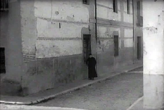 Reconstruyendo la escena el párroco vendría por la calle Nueva desde la calle Santiago, encontrándose con el usurero en la confluencia con la calle de Esteban Azaña. Este último semeja venir de una calle inexistente que prolongaría a la de Esteban Azañá, aunque en realidad se trata del rincón de la Mutual Complutense donde estaría situada la cámara. Tras despedirse, don Carmelo se marcha por la calle de Esteban Azaña en dirección a la plaza de Palacio, mientras el sacerdote parece tener intención de continuar por la calle Nueva aunque el corte de la escena impide averiguarlo. En cualquier caso, tal como he comentado antes resulta inútil intentar encontrar una lógica a itinerarios que en realidad suele ser una superposición de escenas dispares.
