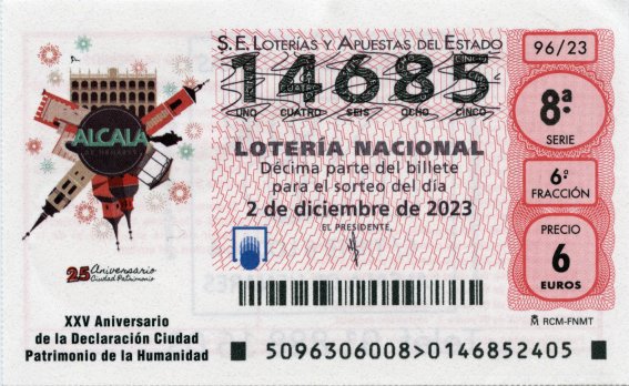 El 2 de diciembre de 2023 se conmemoraba el vigésimo quinto aniversario de la declaración de Alcalá como Ciudad Patrimonio de la Humanidad, aniversario que se celebró en Alcalá con diferentes actos. La Lotería Nacional también se sumó a la efeméride dedicándole el sorteo de ese día, por lo que el tiempo transcurrido en esta ocasión desde el sorteo anterior fue de dos años y algo más de dos meses.