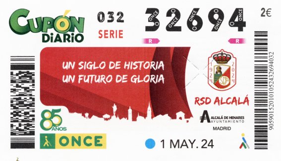 Pasaron dos años y medio hasta que la ONCE conmemoró, en su sorteo del 1 de mayo de 2024, el centenario de la fundación de la Real Sociedad Deportiva Alcalá, la entidad deporiva más arraigada en la ciudad y asimismo uno de los equipos de fútbol más antiguos de la Comunidad de Madrid tras los dos grandes, Real Madrid y Atlético de Madrid, y el Carabanchel y a la par del Rayo Vallecano.