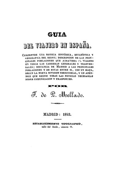 Francisco de Paula Mellado Salvador (Granada, 1818-1876) fue un escritor y activo editor que en 1842 publicó la Guía del viajero en España, un libro que venía a equivaler a los familiares -al menos hasta la implantación del GPS- mapas de carreteras. No era una guía turística aunque incluía descripciones de las principales poblaciones, ni tampoco un diccionario geográfico al estilo de los de Miñano (1826) o Madoz (1846-1850), ya que su pretensión, según explicaba el propio autor, era la de ayudar a los viajeros en sus trayectos por España en unos años en los que la infraestructura viaria -carreteras y caminos, puesto que todavía no se habían comenzado a construir los primeros ferrocarriles- de nuestro país era, por decirlo de una manera suave, extremadamente precaria, siendo por ello de sumo interés estar informado sobre el itinerario a seguir y el tiempo necesario para recorrerlo, las poblaciones que se atravesarían y los lugares en los que se podría comer, descansar y relevar las caballerías.