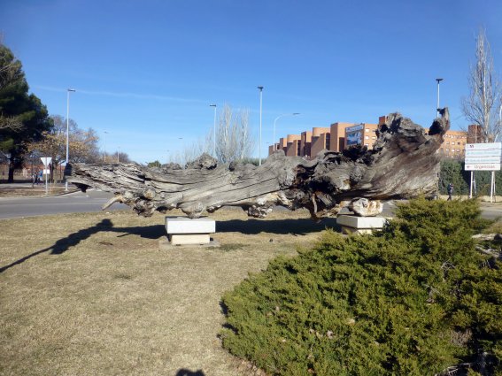 Una de las rotondas del campus, concretamente en la que se encuentra la entrada a las Urgencias del hospital, está adornada con un gran tronco seco que debió ser espectacular cuando todavía estaba vivo. En una de las dos peanas que lo soportan está adosada una placa de bronce que explica su origen: