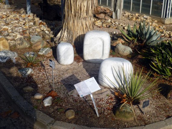 Junto al invernadero nos encontramos con esta obra escultórica, titulada Tríptico en blanco, obra de la escultora portorriqueña Mª Antonia Román Prado. Se trata de tres piezas de mármol de Carrara talladas en un estilo abstracto al que acompañan, según el rótulo, vagas alusiones figurativas o simbolistas.
