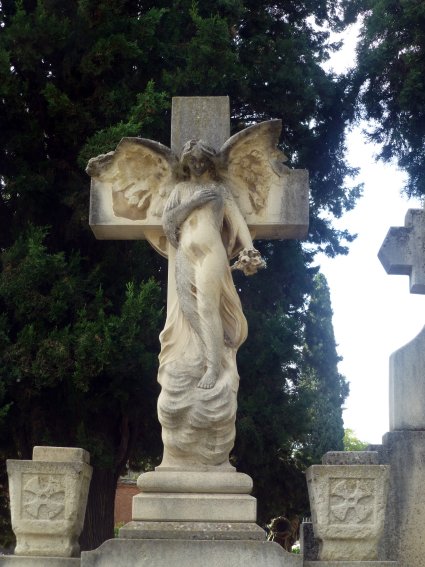 Aunque las esculturas de ángeles, tal como he comentado, son de innegable índole religiosa, al no estar adscritas a una vocación particular -salvo quizás la del Ángel de la guarda- he preferido incluirlas en el apartado de la iconografía alegórica. En el cementerio los hay de diversos tipos: infantiles y adultos, orantes, meditabundos, dolientes, de la guarda, e incluso existe alguno en una actitud que se podría calificar de triunfal.