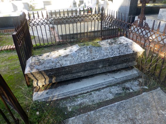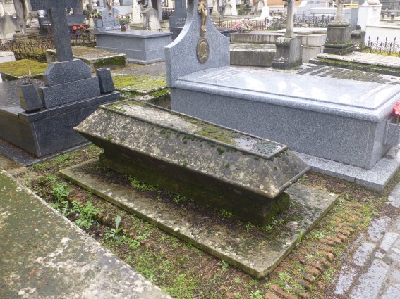 Antes de seguir adelante es preciso explicar que por iconografías laicas entiendo aquéllas sin relación, al menos aparente, con la simbología religiosa sean éstas del tipo que sean, lo cual no siempre es fácil de discernir. Y para empezar nada más alegórico puede encontrarse en un cementerio, y a la vez más sobrio, que una lápida con forma de ataúd, de las cuales existen al menos dos. Lamentablemente el deterioro provocado por el tiempo -se trata de sepulturas antiguas- y la acumulación de musgo en la cara superior de la piedra convierten en ilegibles los texto de estos singulares monumentos.