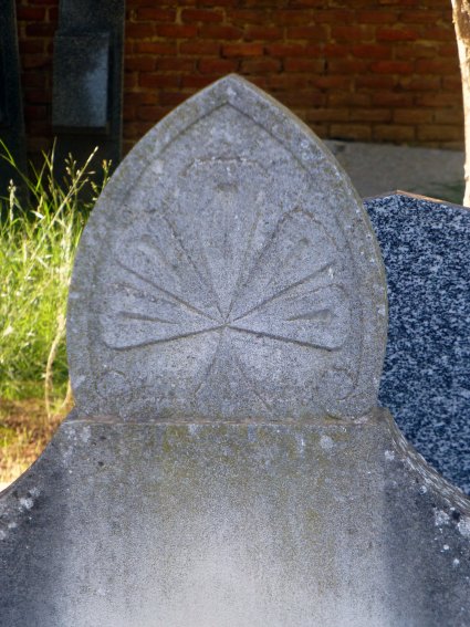 Más complicado resulta, al menos para mí, interpretar el significado de esta estela, que reproduce el dibujo estilizado de lo que parece ser una hoja pentalobulada. Quizás pudiera tratarse de un trébol de cinco hojas, símbolo de buena suerte al igual que el de cuatro, pero nada puedo afirmar dado que no he encontrado referencias a su uso con fines funerarios.