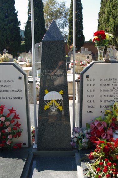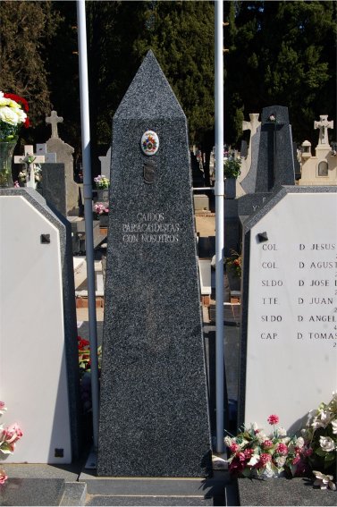 Mención especial merece el sobrio panteón de la Brigada Paracaidista, dado que no se trata de un edificio cerrado sino de un conjunto de sepulturas agrupadas en torno a un obelisco central. Las tumbas, todas iguales, están cubiertas por unas sencillas losas de granito y cuentan con unas lápidas que ofician de cabeceras por ambos lados, figurando en ellas los nombres de los militares en ellas enterrados. El obelisco, también de granito, tiene dos de sus caras grabadas. En la delantera figuran la leyenda A LOS QUE DIERON SU VIDA AL SERVICIO DE ESPAÑA y el escudo simplificado de esta unidad militar, un paracaídas abierto sobre la cruz de San Andrés. La cara trasera tiene adosados dos pequeños escudos metálicos, uno esmaltado que reproduce los guiones de sus diferentes secciones, y otro de bronce con el escudo de la Brigada, junto con el texto CAÍDOS PARACAIDISTAS CON NOSOTROS.