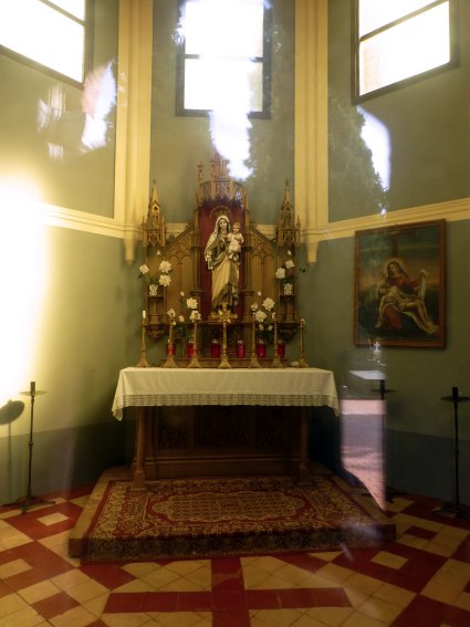 Dada su escasa capacidad resulta difícil imaginarse un servicio religioso en su interior, aunque basta con apreciar la existencia frente a ella de un banco de piedra con rodillos de hierro en su parte superior para adivinar que el arquitecto la diseñó con objeto de que los ataúdes fueran depositados en el citado banco en el exterior de la capilla, realizándose los servicios religiosos se realizarían al aire libre quedando la capilla tan sólo como sustituta del presbiterio y, supongo, también como albergue del sagrario, aunque está documentada la existencia en ella de imágenes y pinturas hoy desaparecidas.