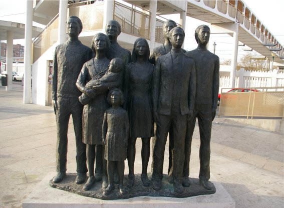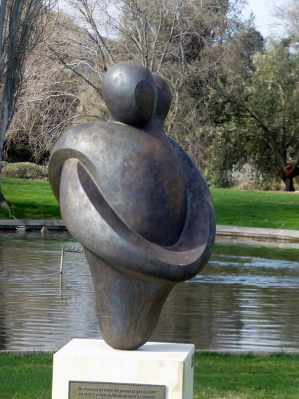La escultura representa a dos personas abrazadas, y en la parte frontal del pedestal tiene adosada una placa, también de bronce, con la siguiente inscripción: