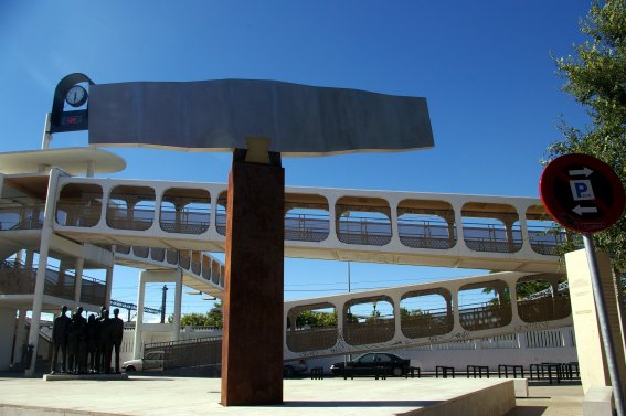 El monumento es un cilindro de sección oval confeccionado en acero cortén. Consideraciones estéticas aparte, el problema que yo encuentro a este material es que su color oscuro dificulta la legibilidad de los textos; pero éste es otro tema.