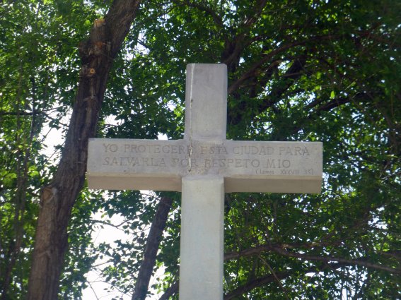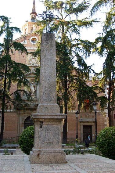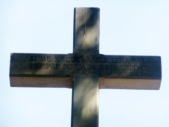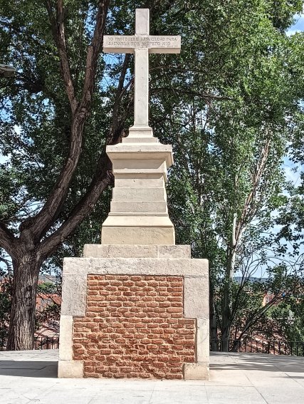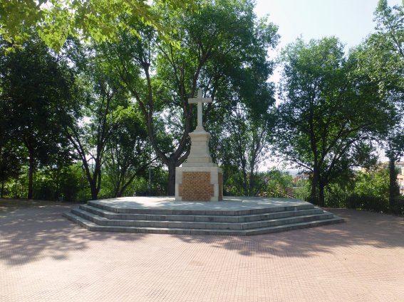 Hecha esta aclaración, paso a considerar la más antigua de todas ellas -en general seguiré para su enumeración la pauta cronológica de su erección-, la Cruz del Siglo, cuya historia cuento con detalle en el correspondiente artículo1. Se da la paradoja de que, pese a ser uno de los monumentos más antiguos de la ciudad -tan sólo la estatua de Cervantes y el busto del Empecinado la superan-, es mucho menos conocida que éstos y otros muchos posteriores, sin duda debido a lo excéntrico de su ubicación en un pequeño jardín junto a la antigua Universidad Laboral, al borde del talud que bordea el alcor del Campo del Ángel... que curiosamente no es su asentamiento original.
