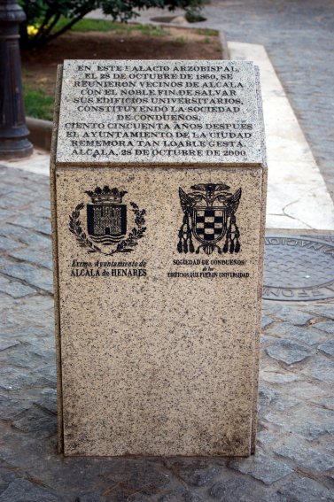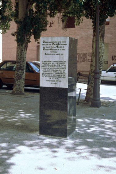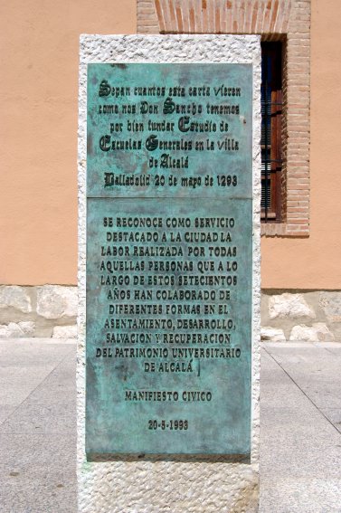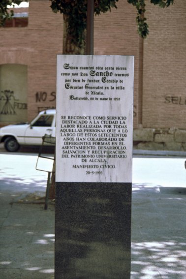 En 1993 se cumplía el séptimo centenario de la creación en Alcalá de unos Estudios Generales que los historiadores locales siempre han considerado como el embrión de la futura universidad cisneriana, pese a no existir certeza absoluta de que tal institución llegara a existir realmente, cabiendo la posibilidad de que quedara tan sólo en uno de tantos intentos fallidos de los que tan pródigas son las crónicas complutenses. De lo que no cabe la menor duda es de que los Estudios Generales sí fueron fundados, al menos sobre el papel, gracias a la iniciativa del arzobispo de Toledo, y por lo tanto señor de Alcalá, Gonzalo García Gudiel, con el beneplácito del rey Sancho IV que fue quien dio la autorización para establecerlos. Es este hecho el que conmemora la lápida de bronce adosada a un pequeño monolito que se alza en la plaza de la Victoria, lugar en cuya cercanía se cree que debieron de tener su asentamiento los citados Estudios Generales.