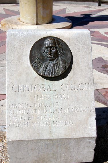 Como es sabido, una de las entrevistas mantenidas entre Cristóbal Colón y los Reyes Católicos tuvo lugar en Alcalá el 20 de enero de 1486, convirtiéndose en la aportación de nuestra ciudad -no por pasiva carente de importancia- a la gesta del descubrimiento de América. Por esta razón, y coincidiendo con el quinto centenario de este acontecimiento, en 1986 se inauguró el monumento conmemorativo de la plaza de los Santos Niños, un grupo escultórico obra de Juan Antonio Palomo formado por un astrolabio de bronce -al que el gracejo popular pronto bautizó como la Piruleta- rodeado por un pavimento que reproduce la rosa de los vientos, todo ello encerrado por un pequeño banco circular jalonado por tres pequeños plintos de piedra caliza dedicados a los tres personajes alcalaínos, o vinculados con la ciudad, que de una u otra manera tuvieron algún tipo de vínculo o relación con el Nuevo Continente: el propio Cristóbal Colón, el historiador Antonio Solís y el explorador Pedro Sarmiento de Gamboa. Tal como puede apreciarse en las fotografías, cada uno de estos plintos cuenta con un medallón de bronce y una leyenda alusiva a los homenajeados. Los textos de las leyendas son los siguientes:
