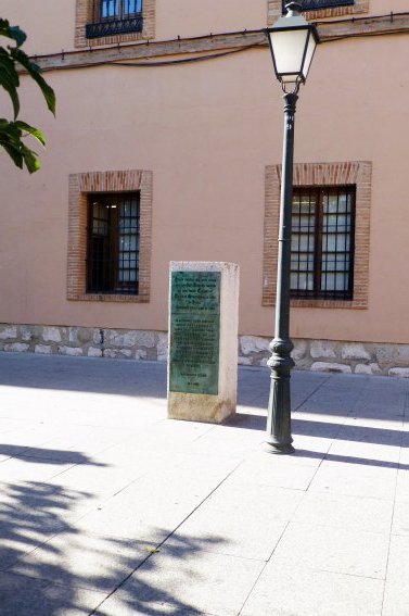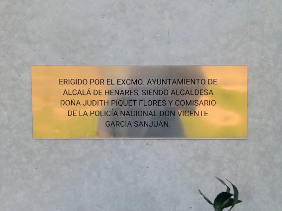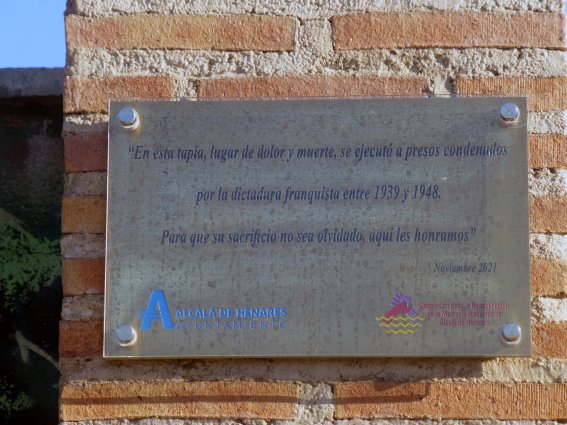 Junto con los logotipos del Ayuntamiento y de la Asociación para la Recuperación de la Memoria Histórica de Alcalá de Henares, promotores de la iniciativa. Tras ser vandalizada, la placa fue reemplazada por otra con el mismo texto.