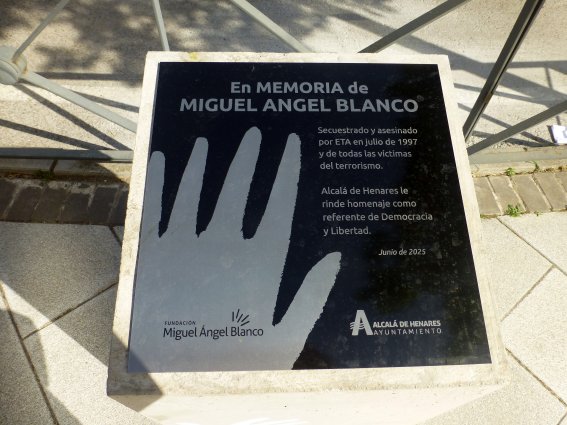 Miguel Ángel Blanco fue un joven concejal de la localidad vizcaína de Ermua cuyo secuestro por la banda terrorista ETA y posterior asesinato el 13 de julio de 1997 estremecieron a toda España. Alcalá ya contaba con una avenida con su nombre en Espartales Norte, a la que el Ayuntamiento sumó la inauguración el 19 de julio de 2025 en la glorieta de Enrique II, situada en la confluencia de ésta con la avenida de las Víctimas del Terrorismo, de un monumento en su memoria.
