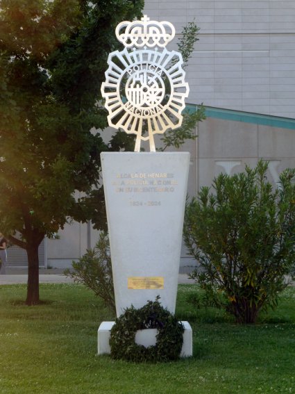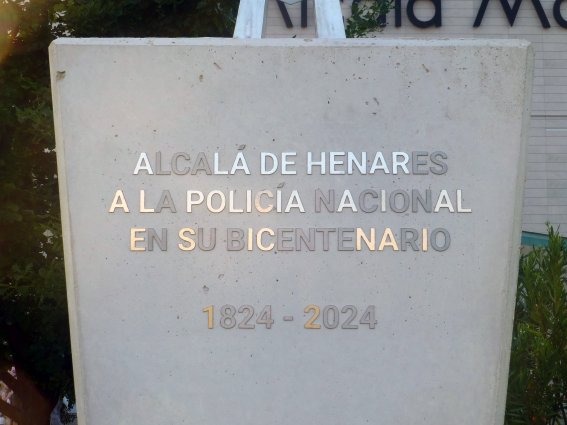 Aunque ya en 2013 la ciudad había homenajeado a la Policía Nacional, con ocasión del cuadragésimo aniversario de su presencia en Alcalá, levantando un pequeño monolito frente a la fachada de la comisaría, el 28 de mayo de 2025, conmemoró el segundo centenario de su fundación, que había tenido lugar en 2024, con un segundo monumento situado al otro lado del edificio, en el jardín que separa su fachada trasera del centro comercial Alcalá Magna, el cual fue bautizado como plaza de la Policía Nacional.