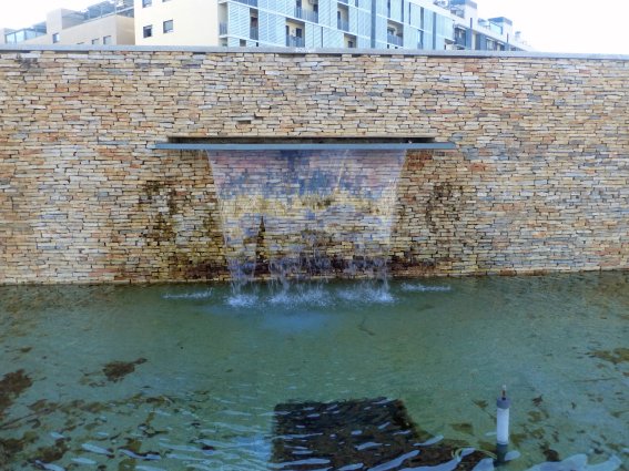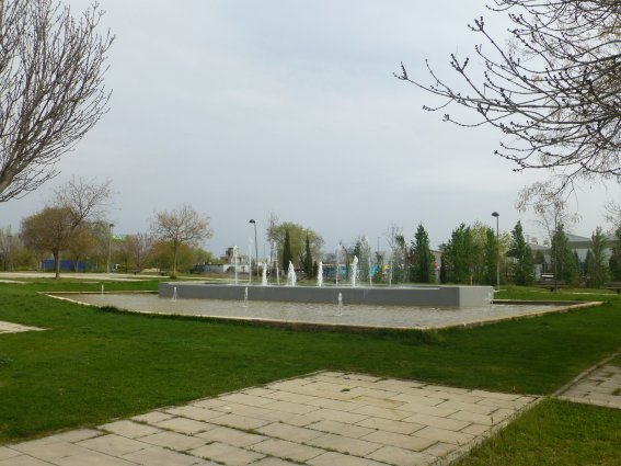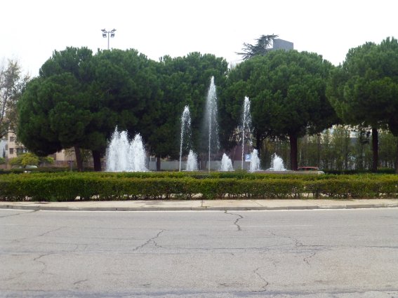 La plaza en cuestión está relativamente escondida salvo para los vecinos, rodeada por el instituto Francisca de Pedraza, el centro de exámenes de conductores y la delegación de la Dirección General de Tráfico. La fuente, por su parte, es un vaso rectangular de 27 × 16 metros con un ángulo truncado -desconozco las razones- que convierte su planta en un pentágono irregular. Al fondo de la fuente hay un segundo vaso, más elevado, de 18 × 4 metros, en el que se encuentran los principales surtidores, aunque también hay algunos más pequeños en el vaso inferior. Aunque su diseñador no se rompió demasiado la cabeza no deja de tener atractivo, aunque lo arrinconado de su ubicación no ayuda demasiado a visitarla.