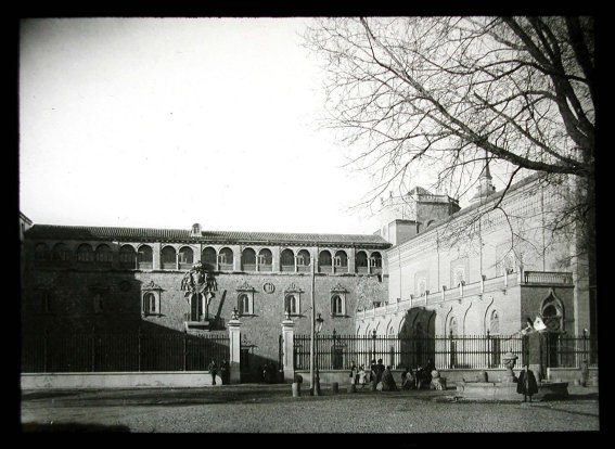 Aunque con esto acabo el listado de las gárgolas que tengo localizadas, todavía se le puede sacar más jugo al tema. Para empezar, hay que tener en cuenta que la restauración del siglo XIX colocó más de una veintena de gárgolas en el exterior del palacio, tal como se aprecia en una postal de 1892 de la plaza de las Bernardas, posterior a la citada restauración, donde éstas aparecen en la fachada oriental y en el torreón, mientras las existentes por el otro lado del torreón o en la fachada sur se ven en otras fotografías también anteriores al incendio.