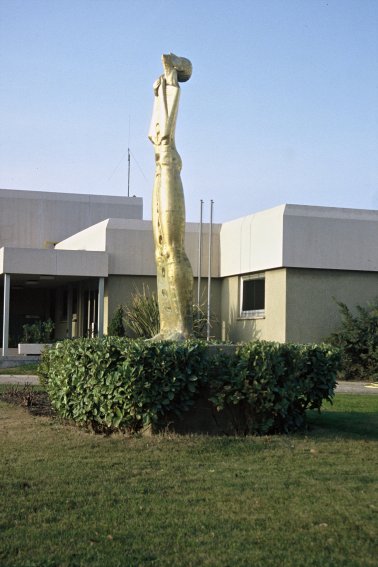 Realizada dos décadas más tarde, puesto que está fechada en 1976, esta imponente escultura de bronce dorado y tres metros y medio de altura fue instalada por los laboratorios Liade en los jardines de sus instalaciones, en la antigua carretera nacional ahora prolongación de la avenida de Madrid, frente al barrio del Pilar. Fue realizada por el escultor catalán Luis María Saumells Panadés (Gironella, Barcelona, 1915 - Tarragona, 1999), autor entre otras obras del monumento a la Batalla del Ebro de Tortosa, y en cuya página web aparece también enumerado un mural escultórico, asimismo realizado para los laboratorios Liade en los años 1977-1978, del cual desconozco su paradero.