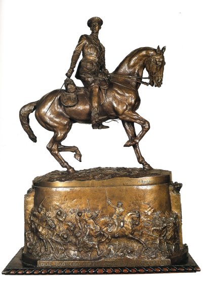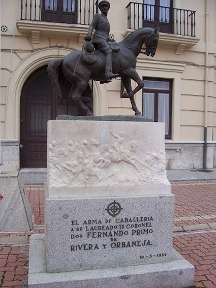 Hemos de dar ahora un salto hasta el siglo XX para encontrarnos con la estatua ecuestre, de pequeño formato, que el prestigioso escultor Mariano Benlliure (Valencia, 1862 - Madrid, 1947) dedicó al teniente coronel Fernando Primo de Rivera, un oficial de Caballería fallecido heroicamente en 1921 en la batalla del Monte Arruit, desarrollada en las cercanías de Melilla durante la retirada de las tropas españolas tras el Desastre de Annual. Esta obra forma parte de un conjunto de piezas escultóricas que Benlliure dedicó a la temática militar, y actualmente se conserva en el Museo del Ejército. Está realizada en bronce y representa al teniente coronel Primo de Rivera cabalgando a caballo, mientras en el pedestal aparece en bajorrelieve una carga de caballería encabezada por éste y, en la base, un rótulo con la siguiente inscripción, correspondiente a la arenga que dirigió a sus soldados antes de cargar contra el enemigo: