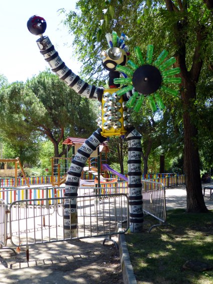 Y no se puede decir que pasara desapercibida, ya que contaba con una envergadura considerable -su altura no bajaría de los cuatro o cinco metros- y estaba realizada en su totalidad con materiales reciclados, antiguos envases de diversos tipos en su mayor parte junto con restos de focos y otros materiales de más difícil identificación, lo que la convertía -en esto sí acerté- en un símbolo del reciclaje. Eran, pues, varias las razones que recomendaban no sólo su preservación, máxime teniendo en cuenta la fragilidad de sus componentes, sino también su exhibición en vez de mantenerla semiescondida y sin ningún cartel indicador, apenas protegida -es un decir- por unas vallas de obras.