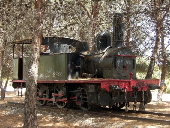 Quizá no sea demasiado conocido que en Alcalá, y más concretamente en el campus universitario, hubo durante años una de estas locomotoras. Se encontraba a la salida del apeadero, en el camino que conduce a la facultad de Ciencias. Según las revistas Vía Libre y Treneando era la antigua locomotora de Renfe 030-0221, en la que la primera serie de dígitos indica el sistema de tracción de los ejes y el segundo sus características técnicas -si portaba ténder incorporado o éste era independiente, y el número de cilindros- y, las dos últimas cifras, su número de serie. Esta locomotora, de pequeño tamaño -8,5 metros de longitud y 4 de altura- y ancho ibérico, fue construida en 1889 en la localidad belga de Lieja por la empresa Saint Leonard. Formaba parte de un grupo de cinco que fueron adquiridas por el ferrocarril de Torralba a Soria, de las cuales se conservan dos: ésta y la 030-0219 utilizada también como ornato en Miranda de Ebro.