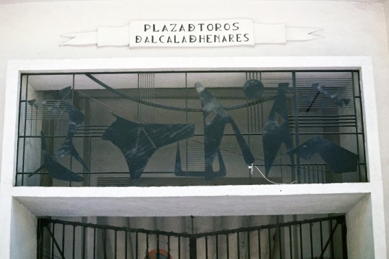 La antigua Plaza de Toros de la avenida de Guadalajara, inaugurada en 1879, fue sometida a una profunda remodelación en 1959 que supuso, entre otras intervenciones, la construcción de una nueva fachada envolviendo a la original. La puerta principal estaba decorada con un mural o relieve metálico formado por planchas de hierro recortado siguiendo un estilo abstracto propio de la época en la que fue realizado. Tras el derribo de la plaza en 1998 el mural desapareció, desconociéndose su paradero. Es una lástima que no se conservara ya que, con independencia de su valor artístico, fue durante varias décadas la principal seña de identidad de uno de los edificios singulares de Alcalá.
