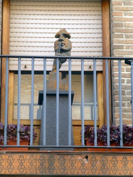 Muy cerca de allí, en el número 3 de la calle de Escritorios, y asimismo en un balcón -resulta curioso este cúmulo de coincidencias- encontré esta interesante escultura a la que desconociendo su nombre real he bautizado como Silencio por razones obvias.Por cierto, no desentonaría en absoluto con las pertenecientes al Museo al Aire Libre que ha sido reubicado en diversas zonas del casco antiguo.