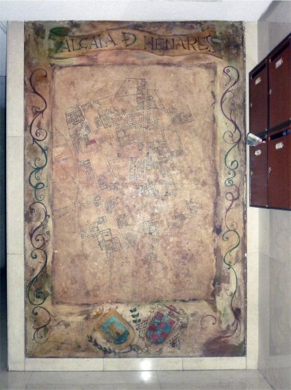 El portal de la finca se encuentra situado en la fachada de la calle de Nebrija, y en su inteior hay colocada una lápida de mármol que reproduce el conocido plano de Alcalá en el siglo XVI realizado a principios del siglo XX por iniciativa del padre Lecanda. Llaman la atención dos detalles. El primero, que el plano está girado noventa grados respecto al original, probablemente a causa de las limitaciones de espacio, de modo que el norte se encuentra a la izquierda y el este está colocado hacia arriba. El segundo, que está policromado. En la parte inferior aparecen dos escudos, el de Alcalá y el de Cisneros, este último con los colores cambiados ya que la enseña heráldica del cardenal alternaba los escaques rojos con los dorados, mientras que aquí este último color aparece cambiado por el azul. En cualquier caso, se trata de un elemento decorativo interesante que, lamentablemente, no está fechado.