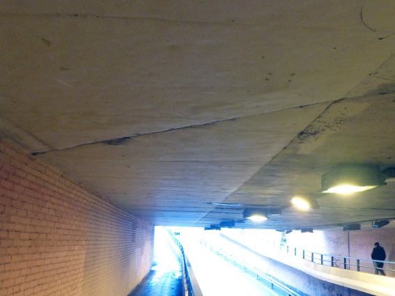 Si se fijan bien, verán que en el techo del túnel, hacia la mitad de éste, hay una línea que lo cruza en diagonal de parte a parte: se trata de la junta entre las dos mitades, y el ángulo que forma se debe a que la calle y las vías no son perpendiculares y al construir el techo del túnel se siguió el eje de estas últimas.