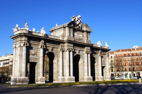 He de comenzar, lógicamente, con la conocida calle de Alcalá, sin duda una de las más importantes y famosas calles de la capital de España. Construida sobre el trazado del antiguo camino que enlazaba Alcalá con Madrid a lo largo de los varios kilómetros que separan la puerta del Sol de Ciudad Lineal, hace algunos años fue prolongada todavía más al añadírsele la antigua carretera de Aragón, por lo que en la actualidad llega hasta Canillejas convirtiéndose así en una de las más largas vías urbanas madrileñas. Es preciso advertir que la glorieta en cuyo centro se alza la famosa puerta de Alcalá no tiene este nombre oficial, sino el de plaza de la Independencia, pese a lo cual es conocida popularmente como tal.
