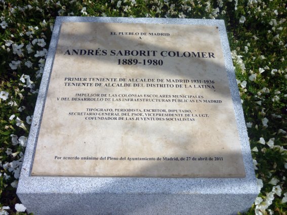 El 27 de abril de 2011, tal como reza la inscripción, el Ayuntamiento de Madrid acordó hacer un homenaje a la memoria de Andrés Saborit, el político alcalaíno que desempeñó importantes cargos, durante el período de la II República, tanto en el PSOE como en el ayuntamiento madrileño, del que llegó a ser concejal y primer teniente de alcalde. La materialización de la iniciativa duraría prácticamente un año, ya que no fue sino hasta el 12 de abril de 2012 cuando se descubrió una lápida -aunque en la invitación oficial figura erróneamente como monolito- en un paseo del parque de la Cuña Verde de Latina, el cual fue bautizado asimismo con su nombre. La lápida y el paseo están situados junto a la confluencia del paseo de Extremadura con las calles de San Manuel y Concejal Francisco José Jiménez, muy cerca de la Casa de Campo y de la estación de metro del mismo nombre.