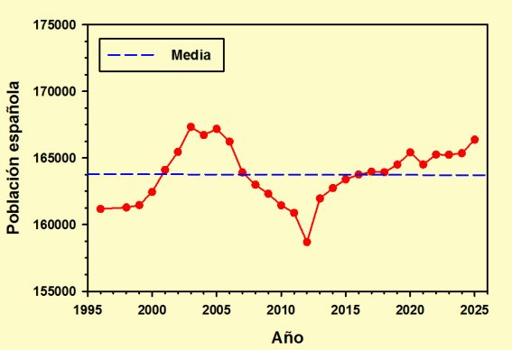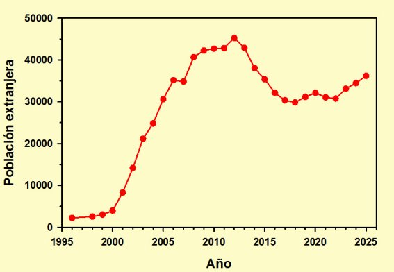 Si nos fijamos en primer lugar en la columna correspondiente a la población española, veremos que ésta era, a fecha de 1 de enero de 2025 -últimos datos publicados por el INE-, de 166.375 censados, superior a la de 1996 en 2.989 personas. Esto quiere decir que se ha mantenido prácticamente estable durante estos últimos años 29 años, con ligeras fluctuaciones que le llevaron a un máximo de 167.333 habitantes en 2003 y a un mínimo de 158.683 en 2012, estando situado su promedio en torno a los 163.800, un valor rebasado a partir de 2017 inicialmente con valores no muy superiores, con una ligera tendencia al alza tras superar el bache de 2021 provocado por la pandemia y una notable subida de algo más de mil personas, aproximadamente un tercio del total, en 2025.