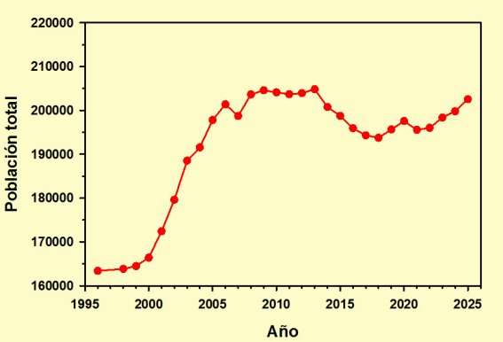 La situación cambia por completo cuando consideramos la población total, en la cual se aprecia una tendencia continua al crecimiento entre 1996 y 2008, con la única excepción de un descenso de 2.657 habitantes en 2007 rápidamente enjugado un año después. Entre 2008 y 2013 la población se mantuvo estable, con ligeras fluctuaciones, en torno a los 204.000; pero en 2014 comenzó una tendencia descendente, mantenida en los años posteriores, que provocó una caída acumulada de 11.072 habitantes en 2018, un 5,41 % sobre el máximo alcanzado en 2013.