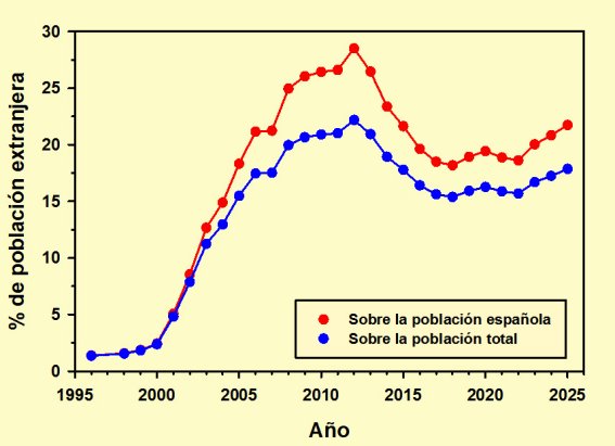 Por último, si en vez de representar la evolución de la población extranjera en términos absolutos lo hacemos con los porcentajes sobre la población española y sobre la población total, obtenemos dos gráficas que no se diferencian en la forma ni entre ellas ni con respecto a la anterior, permitiéndonos apreciar que en 2012 los extranjeros censados llegaron a ser casi un 30 % en comparación con la población española -exactamente un 28,51 %-, proporción que ha descendido hasta el 21,74 % de 2025 aunque con un incremento en los últimos años, mientras los porcentajes correspondientes a este mismo intervalo en relación a la población total son del 22,19 % y el 17,86 % respectivamente.