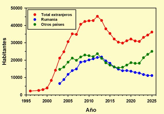 Como puede comprobarse en la tabla, en 2003 la población rumana ya rozaba la tercera parte del total de los inmigrantes, porcentaje que se fue incrementando de forma prácticamente continua hasta rebasar, en 2013, el listón del 50 %. A partir de entonces su peso demográfico comenzó a disminuir, perdiendo en los doce años transcurridos desde entonces 10.664 personas, casi el 51 % de 2013, mientras su proporción en relación al total de la población inmigrante experimentó un descenso del 21,24 %, un porcentaje muy inferior debido a que durante algunos años el resto de las nacionalidades decrecieron todavía más. Sin embargo a partir de 2017 se invirtió la tendencia, creciendo el resto de las colonias extranjeras mientras la rumana seguía descendiendo de forma continua, haciéndolo de forma más acusada en el trienio 2023-25.