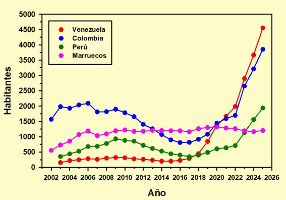 Marruecos, único representante africano de este grupo, ha sido el más constante de los cuatro manteniendo un crecimiento moderado, pero sostenido, que le ha llevado de los 556 censados en 2002 a los 1.205 de 2025, algo más del doble, aunque su máximo llegó a alcanzar los 1.321 en 2020.