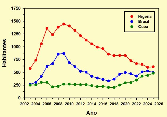 Por razones de simplicidad los he repartido en dos tablas, correspondiendo la primera a los tres con mayor población censada en 2025: Nigeria, Brasil y Cuba.