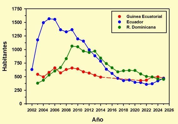 Brasil sí superó el bache, aunque sin llegar a recuperar el máximo de población, Guinea Ecuatorial se mantiene estable y Cuba, con valores modestos hasta 2018, ha experimentado en los últimos años un crecimiento ligero pero continuado.