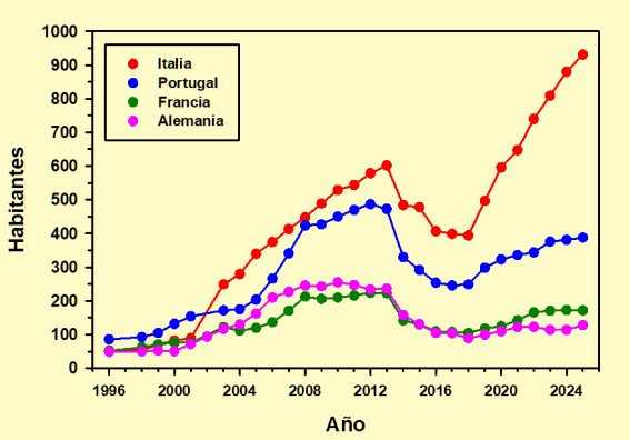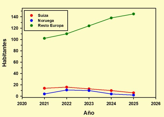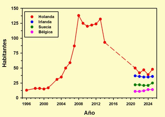 Ya con unos valores mucho más reducidos tenemos al cuarteto formado por Holanda, Irlanda, Suecia y Bélgica. Es necesario advertir que para Holanda faltan tanto el valor correspondiente a 2002 como los del intervalo comprendido entre 2015 y 2020, mientras que para los otros tres países tan sólo dispongo de registros desde 2021. Por consiguiente, lo único que puedo consignar es el llamativo comportamiento de Holanda, con dos máximos en 2008 y 2013 seguidos por una caída, importante porcentualmente, que no se había corregido en 2025 , y la estabilidad de los restantes en el cuatrienio del que dispongo de datos.