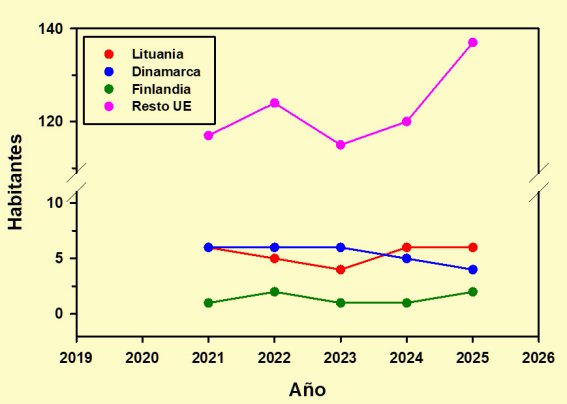 Por último, concluimos el apartado de la Unión Europea con las aportaciones testimoniales de Lituania, Dinamarca y Finlandia, junto con el cajón de sastre donde están incluidos los ciudadanos de Austria, Croacia, República Checa, Chipre, Eslovaquia, Eslovenia, Estonia, Grecia, Hungría, Letonia, Luxemburgo y Malta empadronados en Alcalá. No son demasiados, pero sí un contingente merecedor de ser considerado aunque no resulte posible desglosarlo. Lamentablemente, una vez más tan sólo dispongo de datos a partir de 2021.