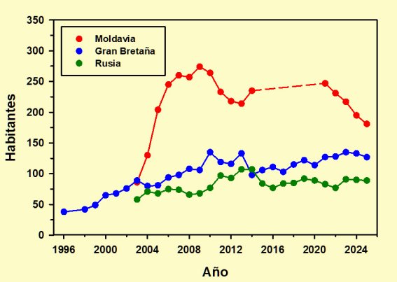 De estos tres países es Moldavia el de mayor peso demográfico; aunque llegó a acerarse a los 300 residentes en 2009, en la actualidad no llega a los 200 habiéndose reducido más de una cuarta parte en los últimos cinco años. La recién llegada Gran Bretaña ha mantenido por lo general un ligero crecimiento con algunos altibajos anuales, sin que aparentemente le haya afectado el Brexit. Rusia, por último, se ha mantenido estable dentro de los moderados valores de su colonia, prácticamente siempre por debajo de las cien personas.