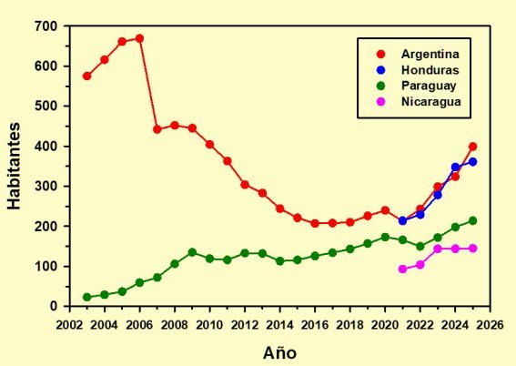 Llama la atención la fuerte bajada de Argentina, que en apenas década y media vio su colonia reducida a la tercera parte, aunque ha repuntado en los últimos años. Paraguay, por el contrario, mantuvo un crecimiento moderado pero constante siempre por debajo de Argentina. La ausencia de información sobre Honduras y Nicaragua nos impide conocer la evolución de sus respectivas colonias con anterioridad a 2021, pudiéndose afirmar tan sólo que en estos últimos cinco años ambos países centroamericanos han experimentado un crecimiento notable.