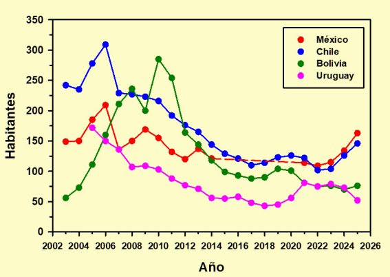 Los cuatro países restantes, México, Chile, Bolivia y Uruguay presentan unos valores tan reducidos que sus fluctuaciones son poco significativas. Por lo general descendieron durante la crisis, sobre todo Bolivia, experimentando cierta recuperación en los últimos años. Por los motivos ya conocidos no me ha resultado posible evaluar la evolución de México entre 2015 y 2020, aunque los datos de los últimos cinco años indican un incremento.
