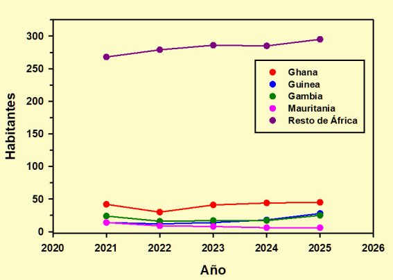 Por el contrario, en la nueva serie que comienza en 2021 aparecieron otros cuatro países: Ghana, Gambia, Guinea (diferente de Guinea Bissau y Guinea Ecuatorial) y Mauritania. Además de disponer por el momento de los datos de tan sólo cinco años, éstos presentan valores muy reducidos. Comienzo con los cuatro primeros.