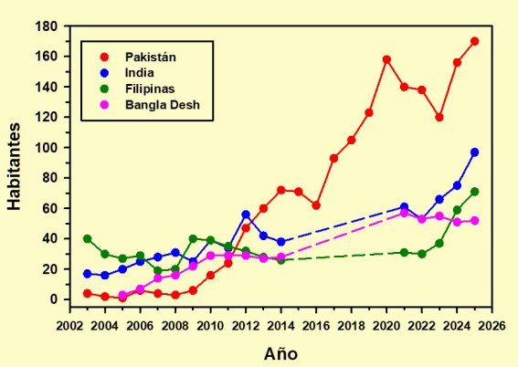 Como se puede comprobar, y dentro de lo relativos que son estos datos a causa de lo reducido de las poblaciones, Pakistán experimentó un crecimiento notable con altibajos mientras los tres países restantes, en el último quinquenio, han mostrado también una tendencia al alza excepto Bangla Desh, que cayó ligeramente aun manteniéndose por encima de los valores anteriores a 2015.