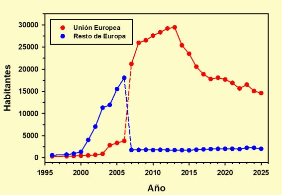 En cualquier caso, la tendencia general a partir de 2007 aparece clara: el número de ciudadanos de la Unión Europea, incluyendo ya a los rumanos y a los búlgaros, continuó creciendo hasta 2013, año en el que alcanzó un máximo de 29.430 censados. A partir de entonces se inició una disminución bastante acusada hasta llegar a los 14.596 de 2025, apenas la mitad del máximo de 2013, aunque a partir de 2020 el descenso se ha producido de una manera más pausada.