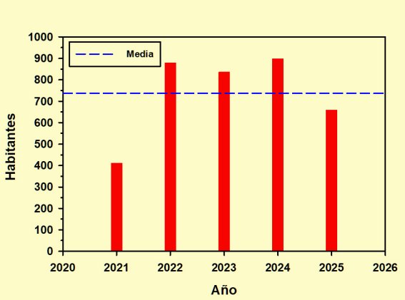 Aunque la gráfica abarca tan sólo cinco años, podemos apreciar que la diferencia entre ambas series estadísticas oscila entre un mínimo de 412 habitantes en 2021 y un máximo de 898 en 2024, con un valor medio de 737. No es demasiado en un conjunto de alrededor de 200.000 personas, apenas un 0,45 % del total, pero no por ello deja de ser llamativo.