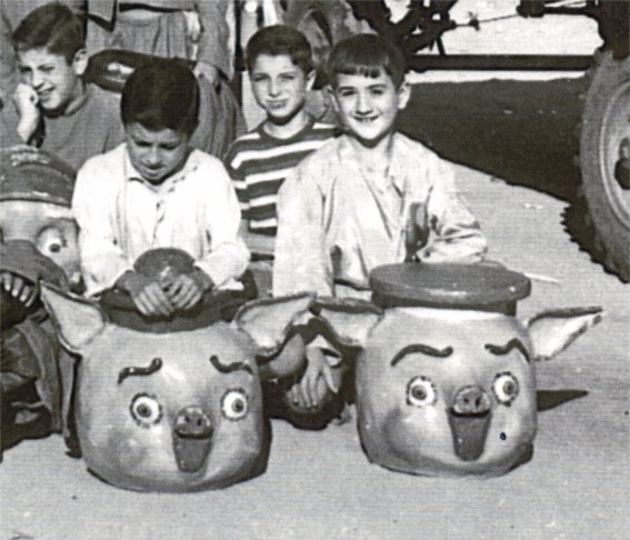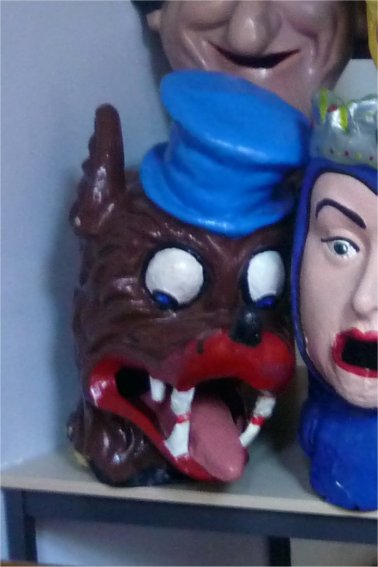 También estaban inspirados en Disney los cabezudos de los Tres Cerditos, hoy desaparecidos y de los cuales no he podido averiguar su origen, ya que el actual es mucho más reciente y fue realizado por una artesana local. Éste está acompañado en la comparsa actual por su mortal enemigo, el Lobo Feroz, fácilmente identificable por su sombrerito que lo diferencia de otras cabezas de lobos que aparecen en los catálogos de los diferentes talleres. Gracias precisamente a este sombrero es posible descartar que se trate de otro más antiguo que aparece en las fotografías antiguas, razón por la que, paradójicamente, no llegó a coincidir probablemente con los Cerditos originales. Al igual que éstos, desconozco su procedencia.