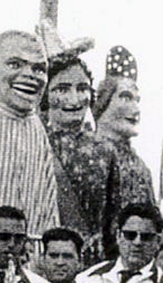 Tal como explico en el artículo dedicado a los gigantes de los años sesenta, en los tres lustros escasos que van desde 1960 hasta 1974, fecha de adquisición de la comparsa cervantina, he podido identificar más de una treintena de gigantes distintos, en su mayoría nuevos salvo la media docena de la comparsa tradicional, a los que habría que sumar un número considerable de cabezudos que en ocasiones eran intercambiados con éstos de una manera un tanto caótica.